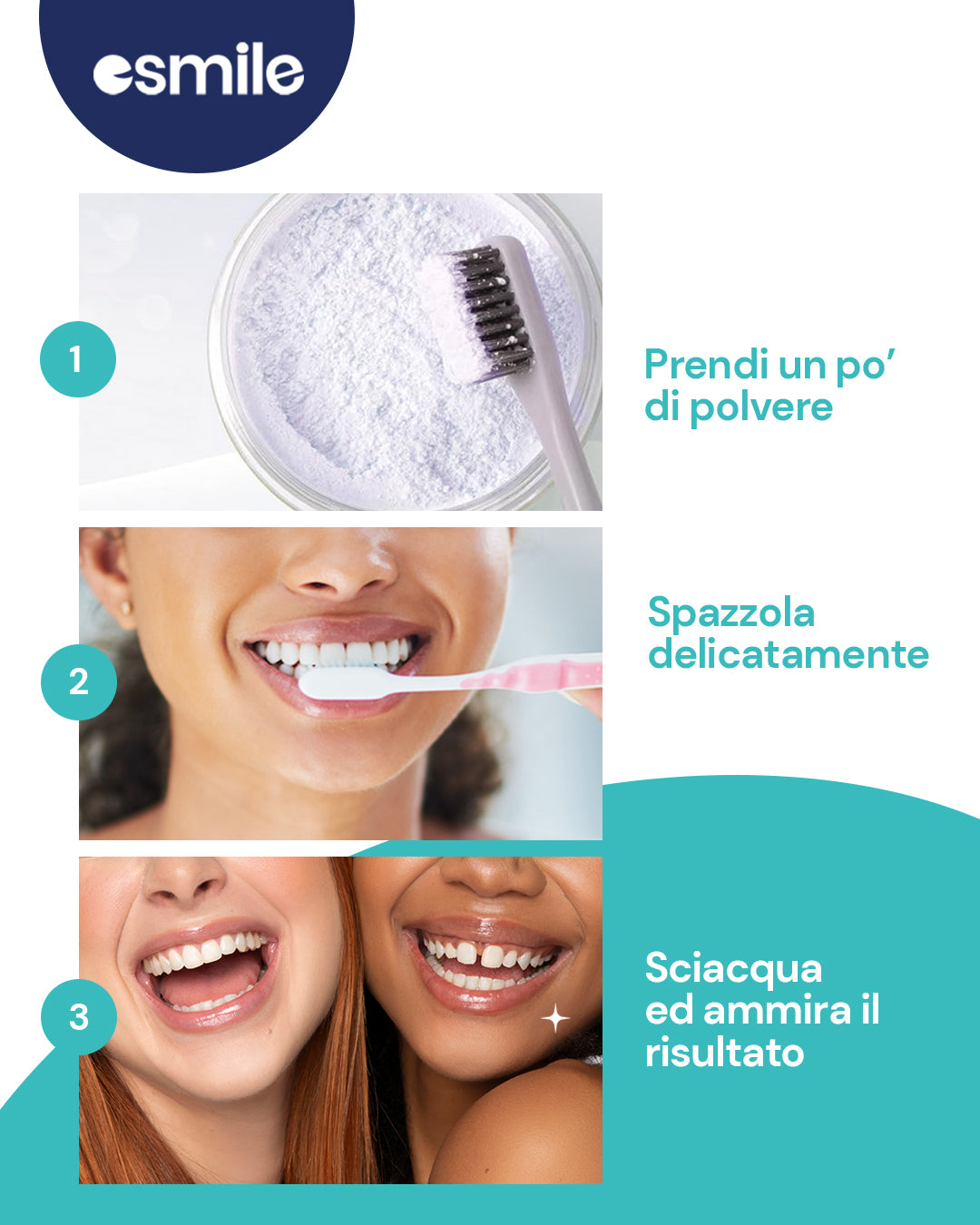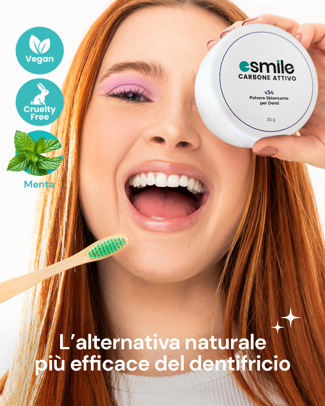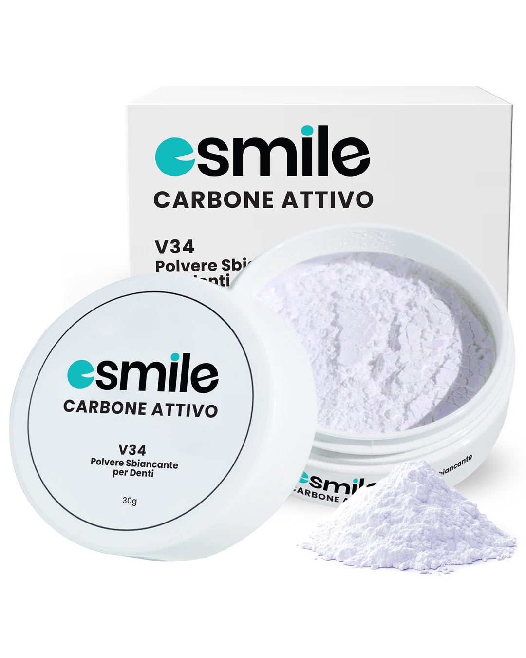 Prova oggi la nostra polvere sbiancante V34 Bianco e scopri il segreto per un sorriso visibilmente più luminoso con ESMILE!
