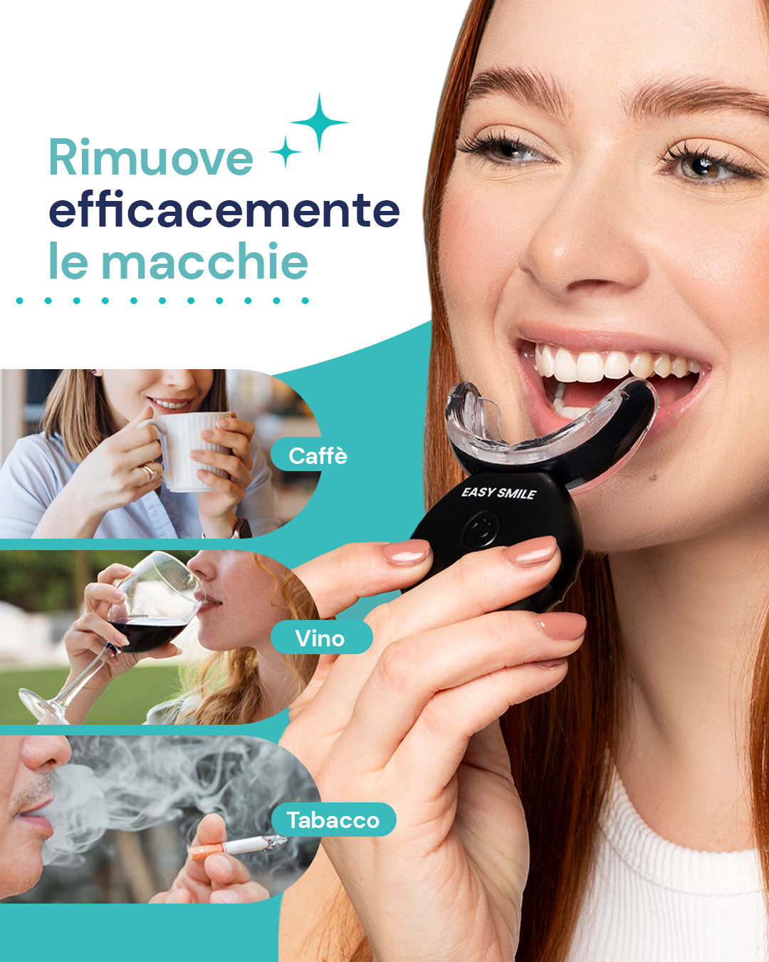 Ritrova la tua fiducia con il nostro kit sbiancante per denti esmile.Non permettere alle macchie di vino, caffè o cibo di rovinare il tuo sorriso. Con il nostro kit, potrai finalmente sfoggiare un sorriso bianco e luminoso in ogni foto.