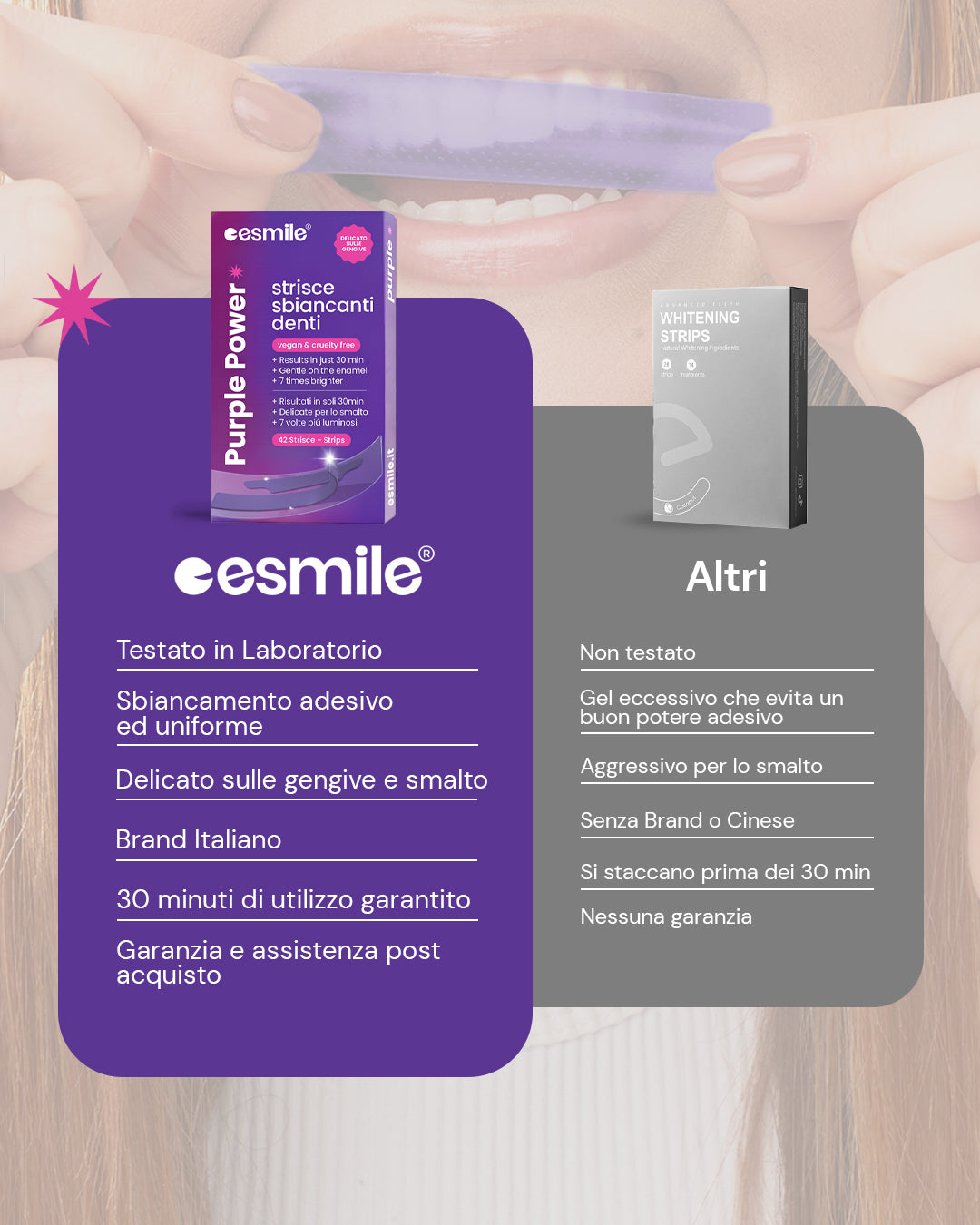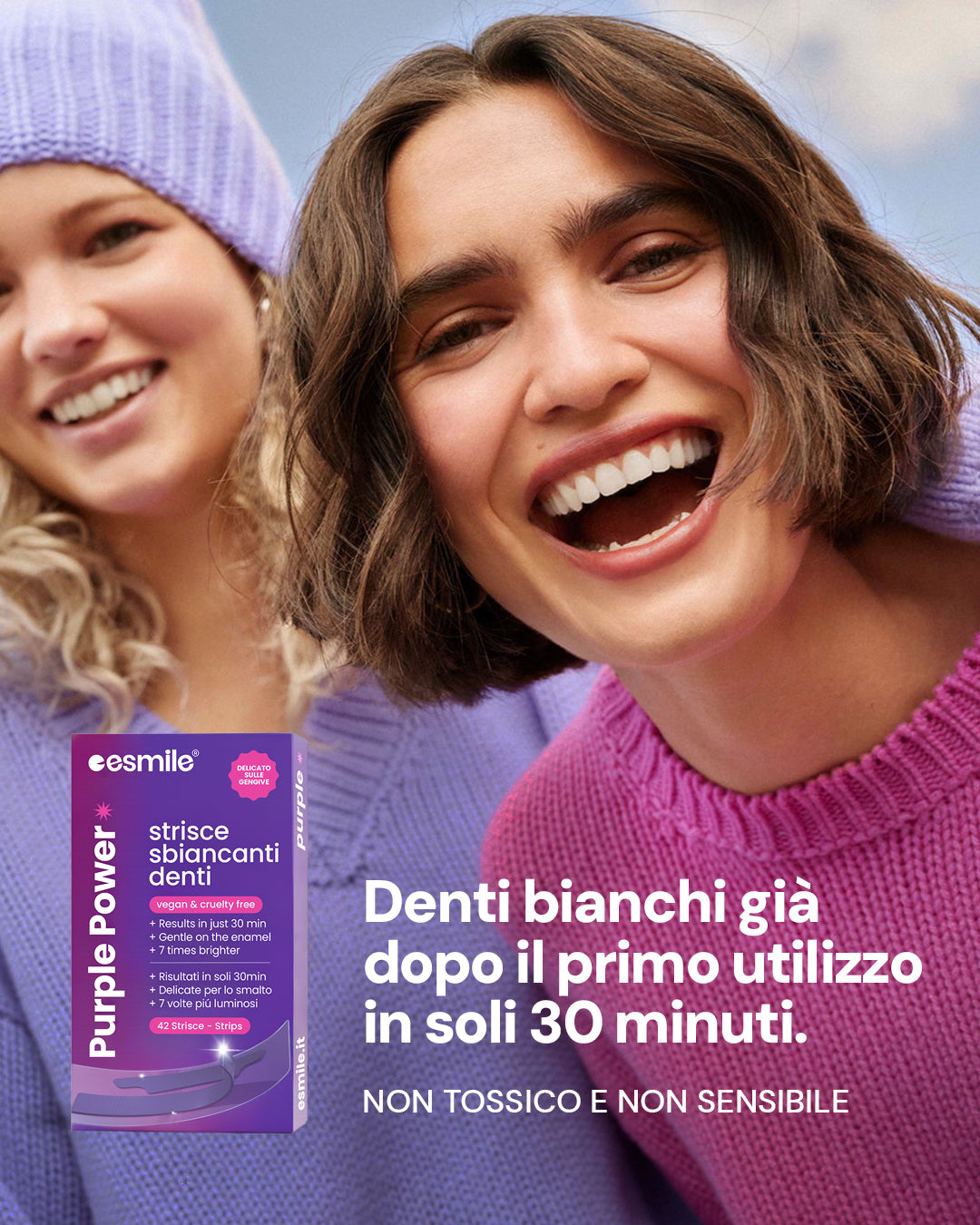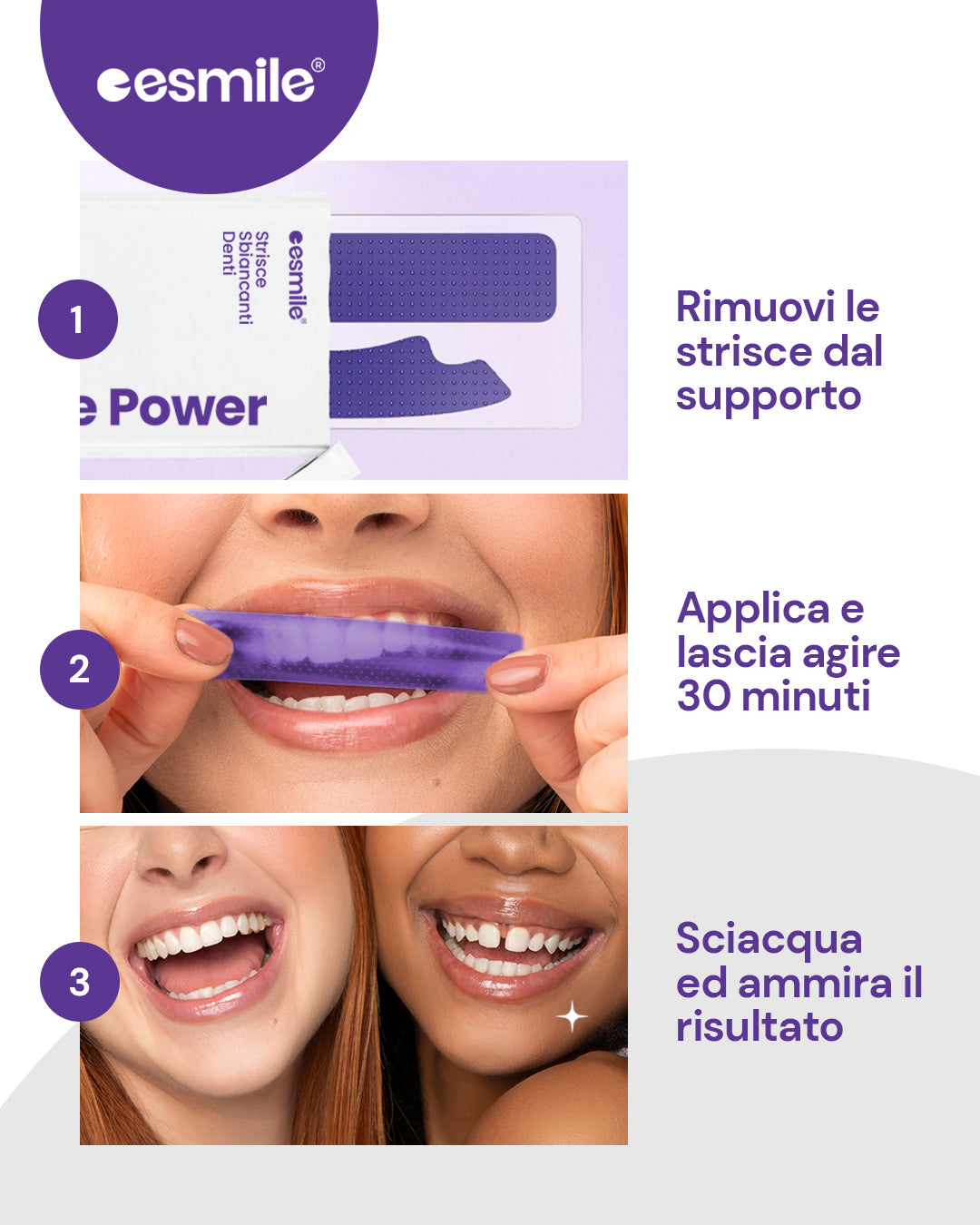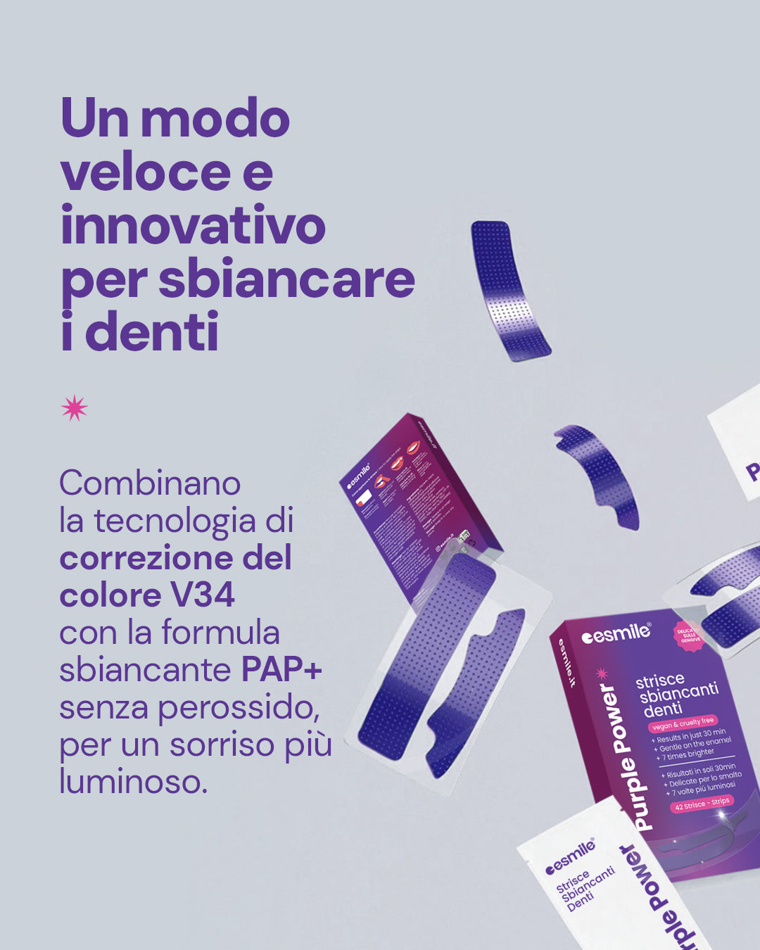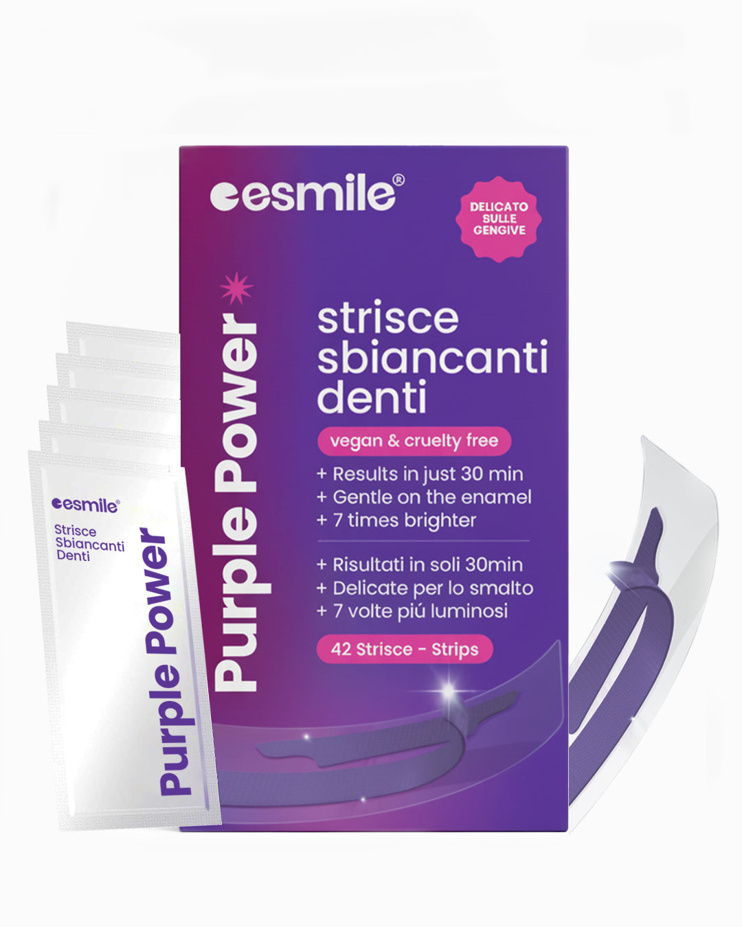 ESMILE è un marchio italiano scelto da migliaia di clienti: queste strisce viola sono l’ultima novità di una linea pensata per chi vuole un sorriso più luminoso, senza imbarazzo.